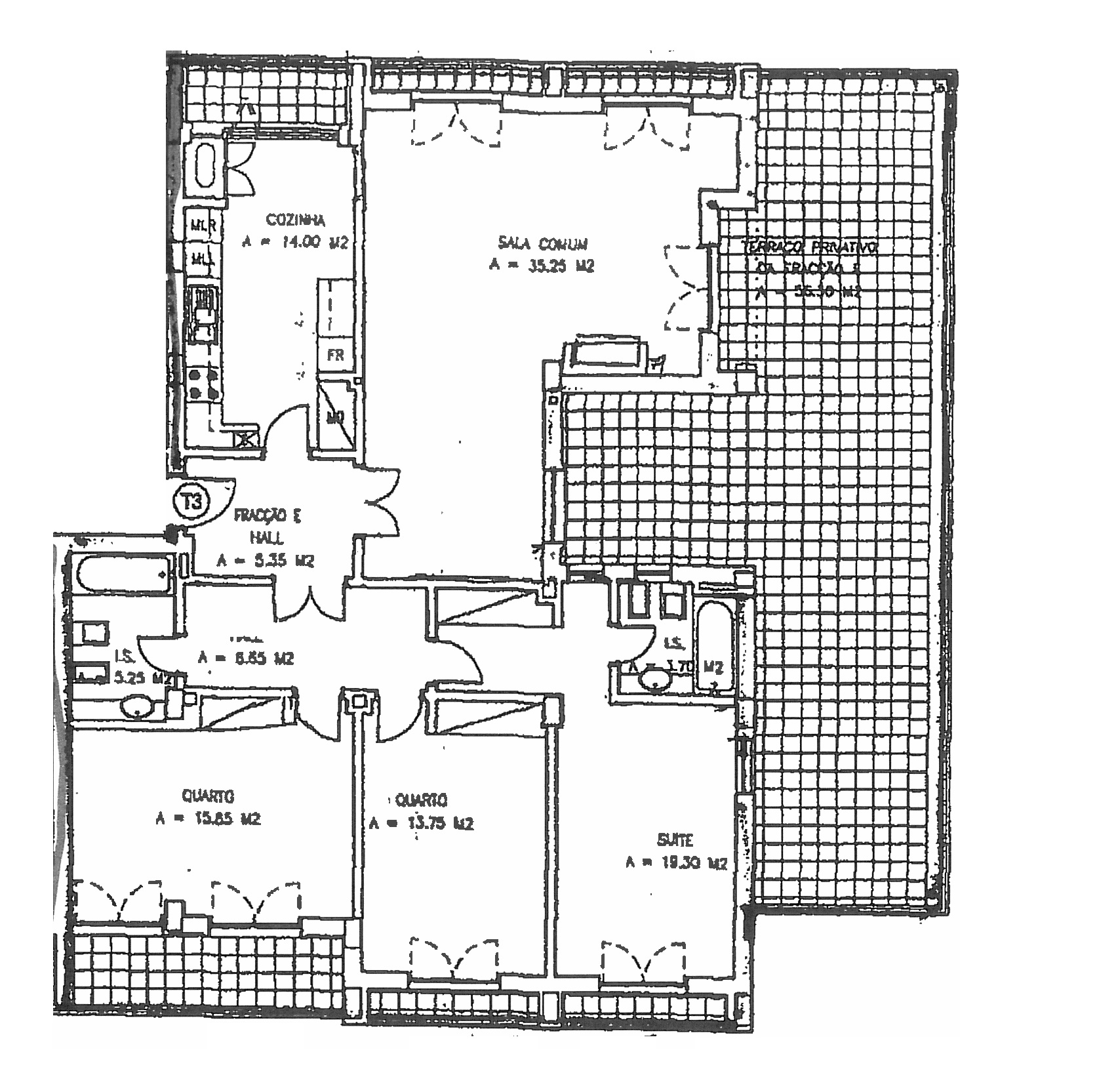 Sala - 35m2 // Cozinha - 14m2 // Suite - 19m2 // Quarto1 - 16m2 // Quarto2 - 14m2 // Terraço - 50m2 // Hall's - 11m2 // Wc's - 9m2 // Box - 15m2